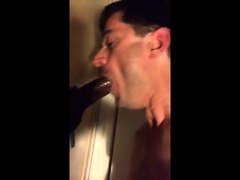 Whitey gives big black cock head at gloryhole