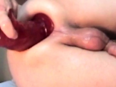 Round Ass Shemale Fucks Ass with a Big Dildo and Masturbates